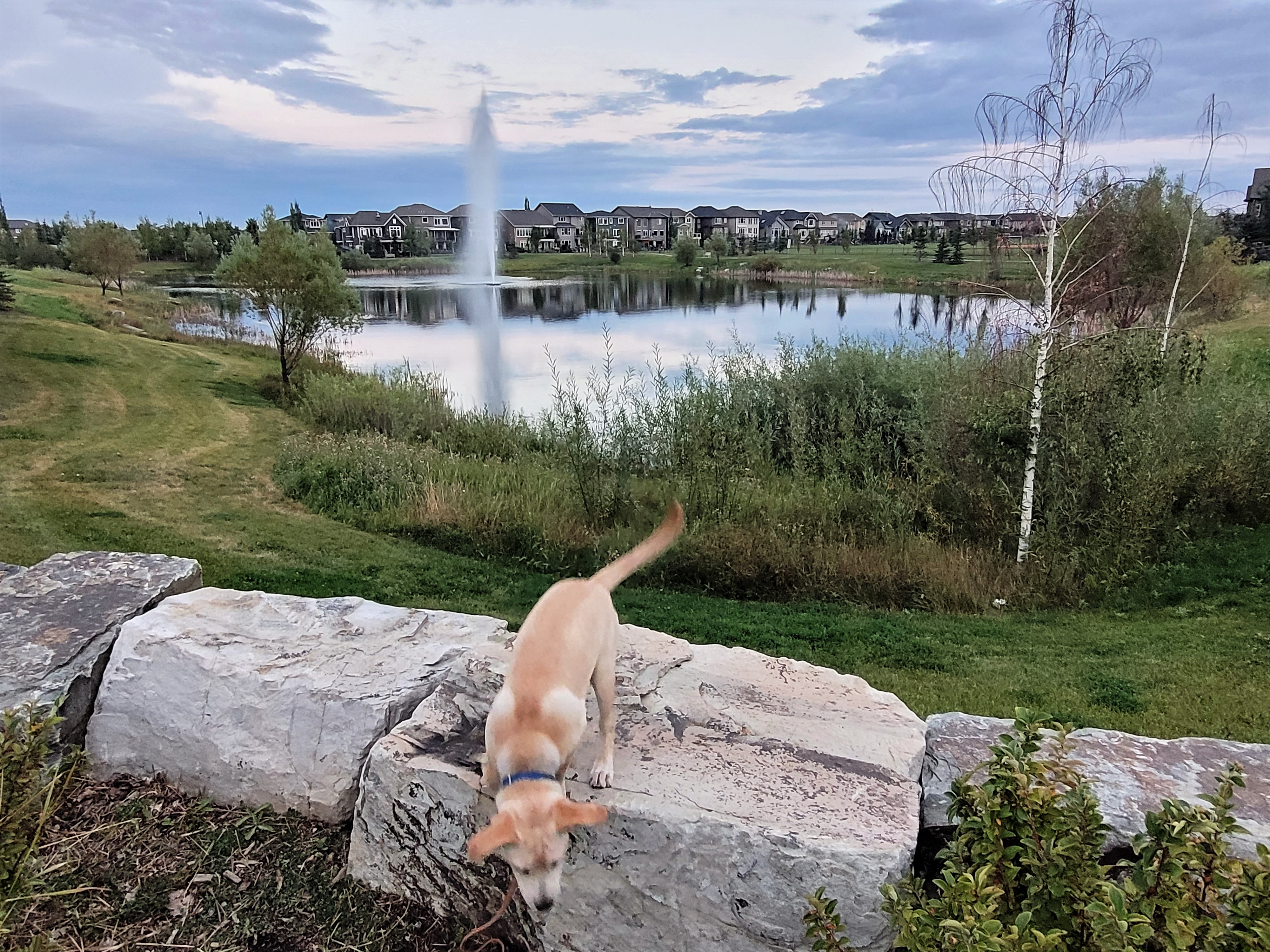 Charlie and Jacques take Princess to the pond at sundown.