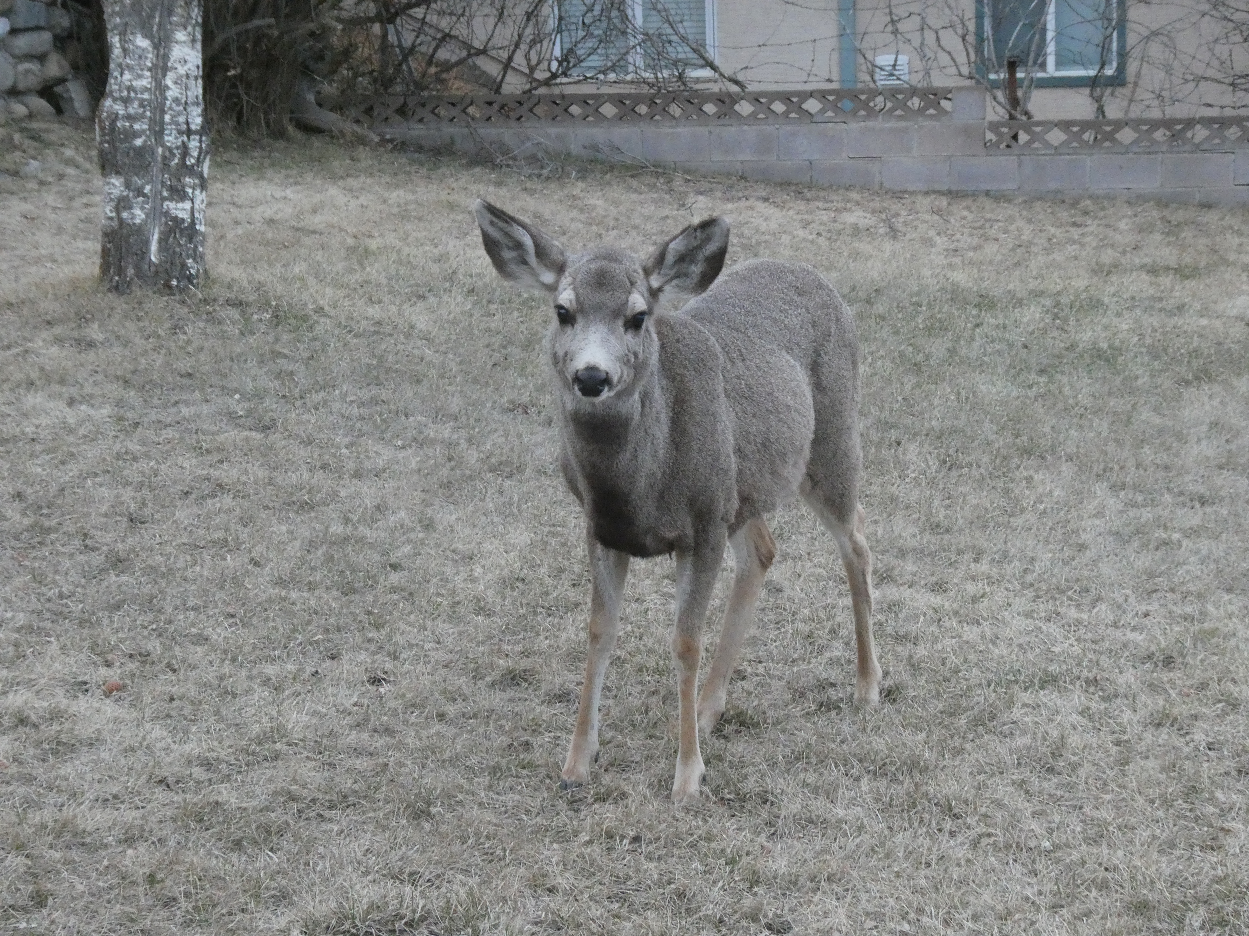Charlie and Jacques encounter 3 deer in the yard when they return from their walk in Blairmore.